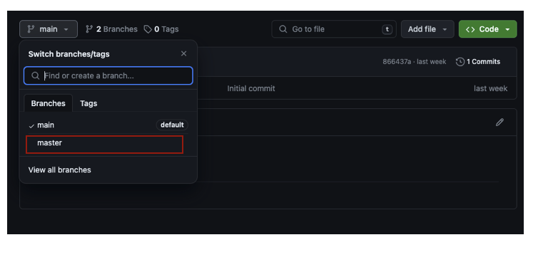 여기서 main을 master로 변경해줘야 변경된 항목을 볼 수 있다. (우리는 Master로 push를 했기 때문)