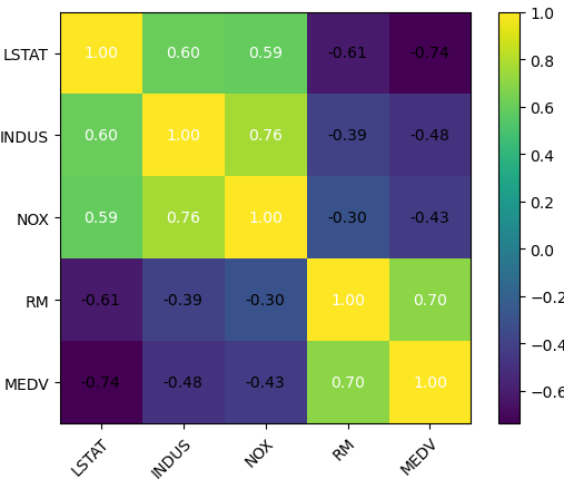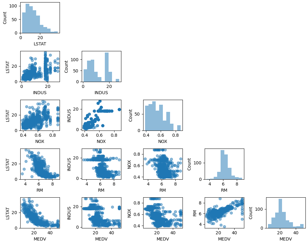 여기서는 LSTAT, INDUS, NOX, RM, MEDV 5개의 변수로 예를 듭니다.